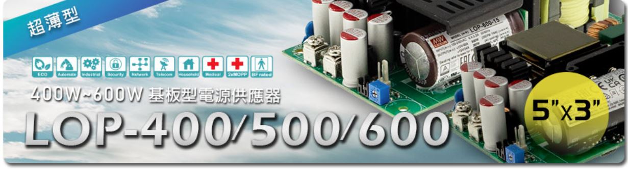LOP-400/500/600 系列:400W/500W/600W 5" x 3" 超薄基板型電源供應器
