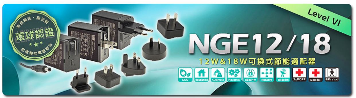 NGE12/18 系列:12W/18W 環球認證插牆可換式 AC 插頭節能適配器