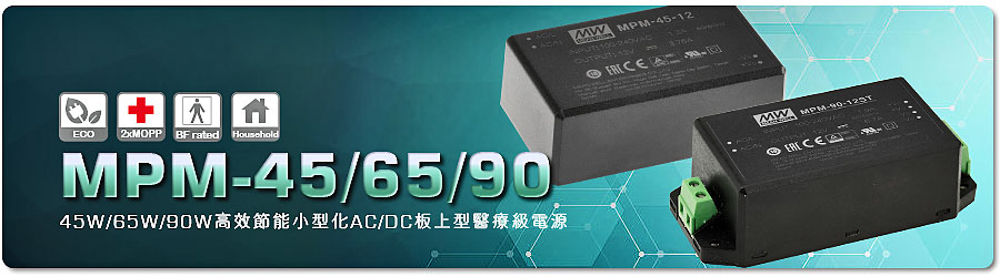 MPM-45/65/90系列 45W/65W/90W AC/DC板上型醫療級電源