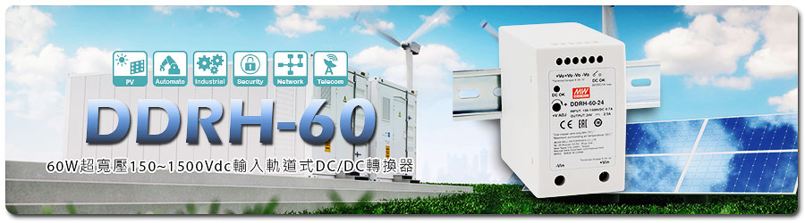 明緯推出首款超寬壓150~1500Vdc輸入的60W軌道式DC/DC轉換器DDRH-60系列