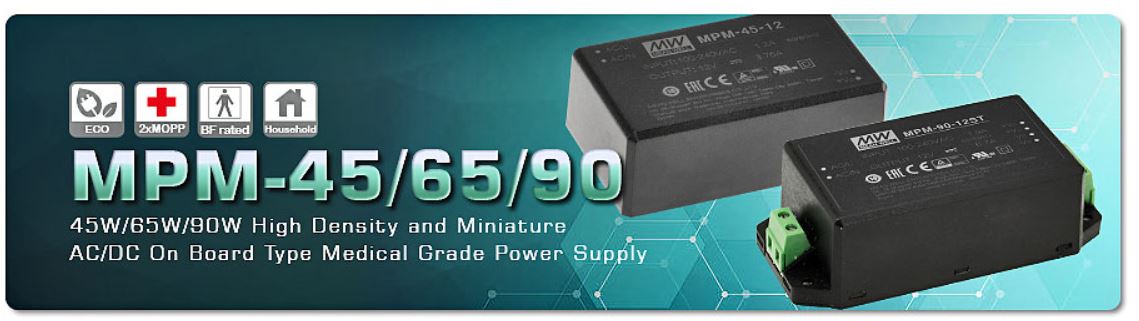 In response to the miniaturization trend and growing power demands of medical equipment, MEAN WELL will expand the 5~30W MPM-05/10/15/20/30 series to cover higher power applications, by releasing the 45~90W MPM-45/65/90 series. These three series are on-board type medical power modules, and they are suitable for direct mounting and soldering onto the PCB. Alternatively, the MPM-45/65/90-xST screw terminal type models can provide additional mounting and wiring options.
