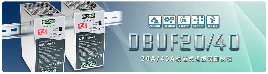 明緯新推出了軌道式20A/40A備援緩衝模組DBUF20/40系列,可搭配DIN rail電源供應器為負載的短暫備援,當AC市電短暫停電或瞬斷時DBUF20/40將會啟動緩衝功能提供穩定24確保系統運行,緩衝時間長短則依據負載電流而定,DBUF20在20A條件下可緩衝350ms,DBUF40在40A條件下可緩衝250ms。