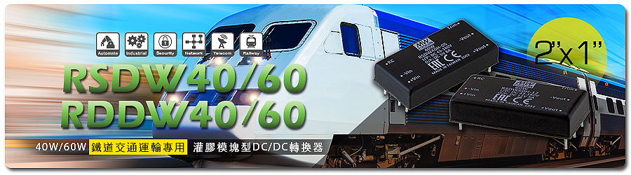 RSDW40/60及雙組輸出的RDDW40/60系列,可充分滿足交通車載系統更高瓦數插板式DC/DC轉換器之需求。