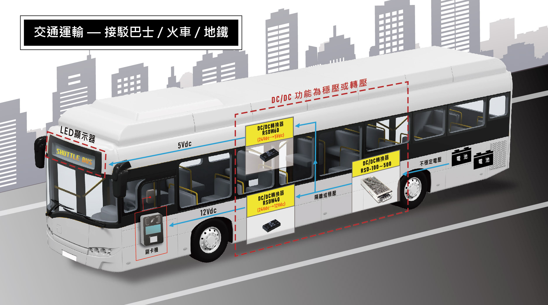 巴士及資通網路、工控自動化、通信設備等產業及需求二極式隔離、DC UPS系統、電池轉壓或穩壓…….等。