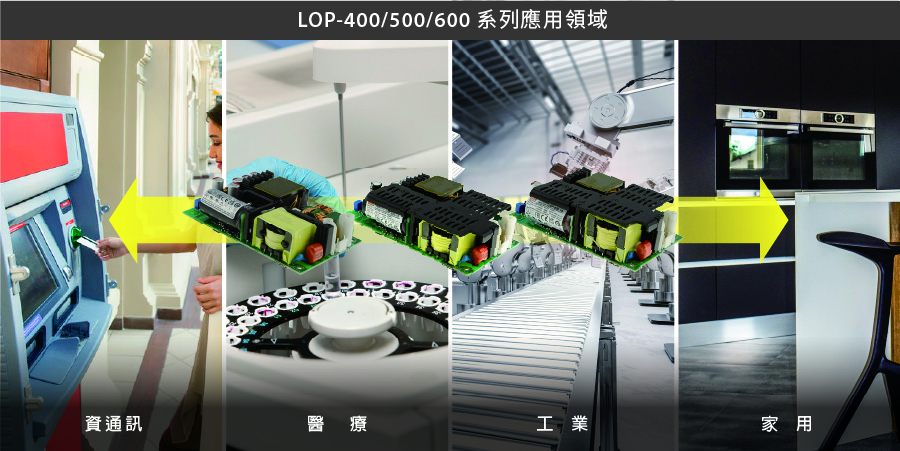400W / 500W/ 600W 的 LOP-400 / 500 / 600 系列,本家族是一系列高可靠、高品質、高效能、安全性高、EMC 性能好、Class I 或 II 系統皆可使用的高性價比內置式基板型電源,非常適合安裝於各種電子儀器設備內。