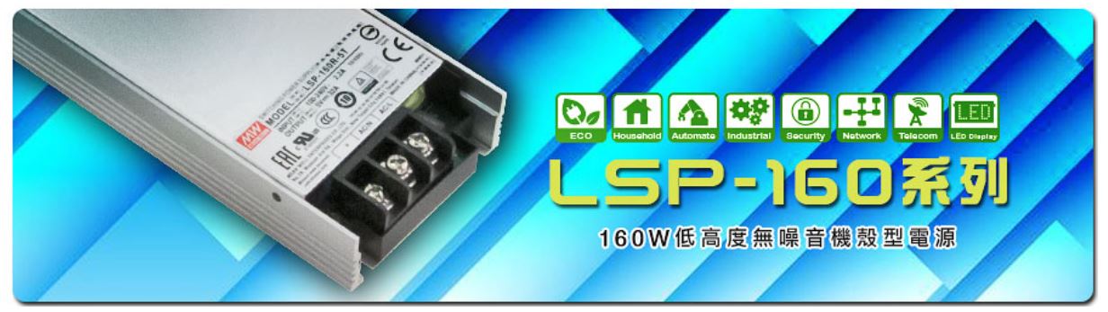 LSP 系列為明緯新推出機殼型電源,主要是提供設備小型化及需要冗餘功能具高穩定度的設備需求而開發,窄面寬(55mm)及低高度(20 mm)尺寸設計並結合無風扇設計, 適合置於室內無噪音的儀器設備或小尺寸顯示屏的應用需求。