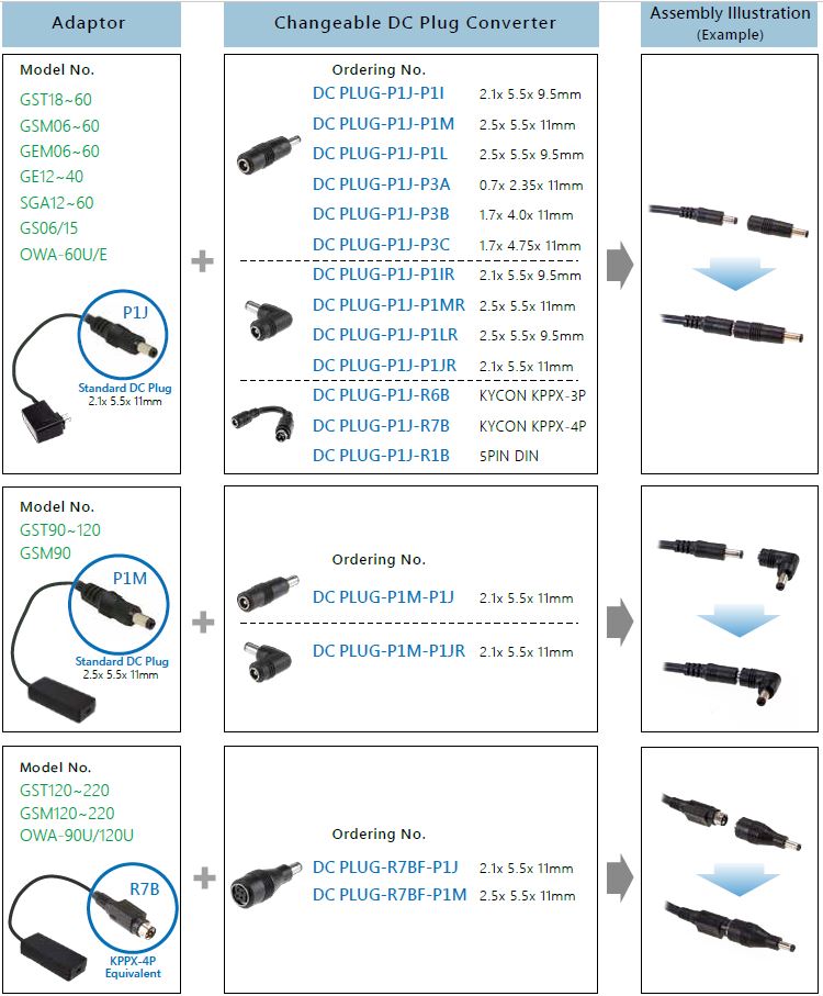 有鑒於此,明緯特別新規劃17款常見的DC Plug轉接頭,使用者可選購所需轉接頭與適配器輸出接頭直接對接,隨插即用、