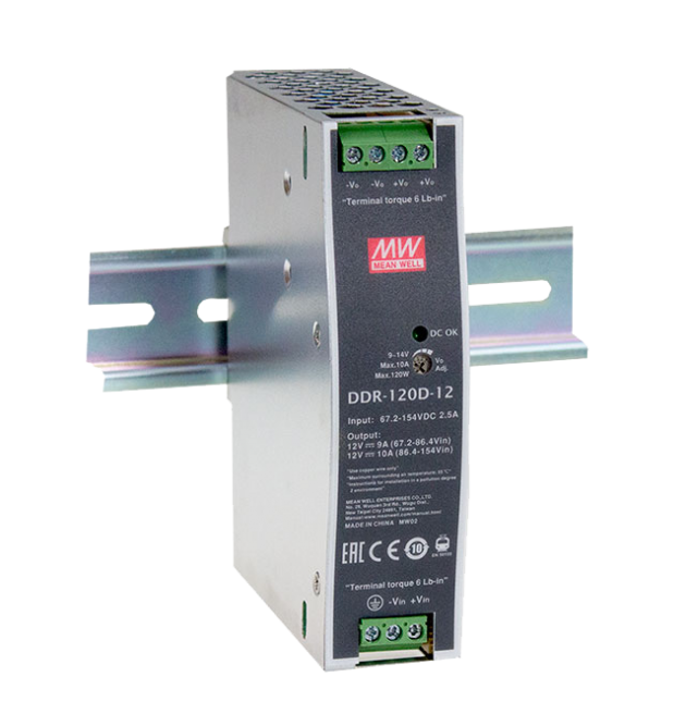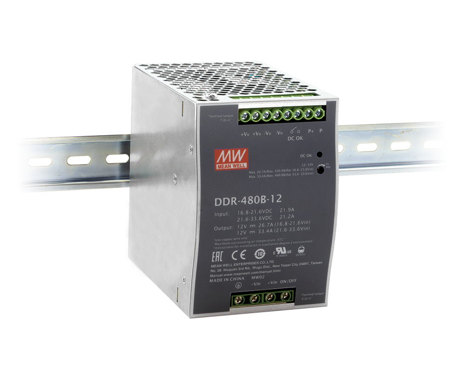 瓦數: 15~480W 功能特性: 4:1寬輸入範圍(DDR-15~60) 2:1 輸入範圍(DDR-120~480) 無風扇設計,可自然風冷散熱 最高效率達92.5% 保護功能:短路保護、過負載保護、過電壓保護 輸入反極性保護、輸入欠壓保護 4KVdc輸入/輸出絕緣電壓(具加強絕緣) 適合安裝導軌:TS-35/7.5或TS-35/15 通過CE / EAC認證 超窄面寬 3年保固期 DDR-480